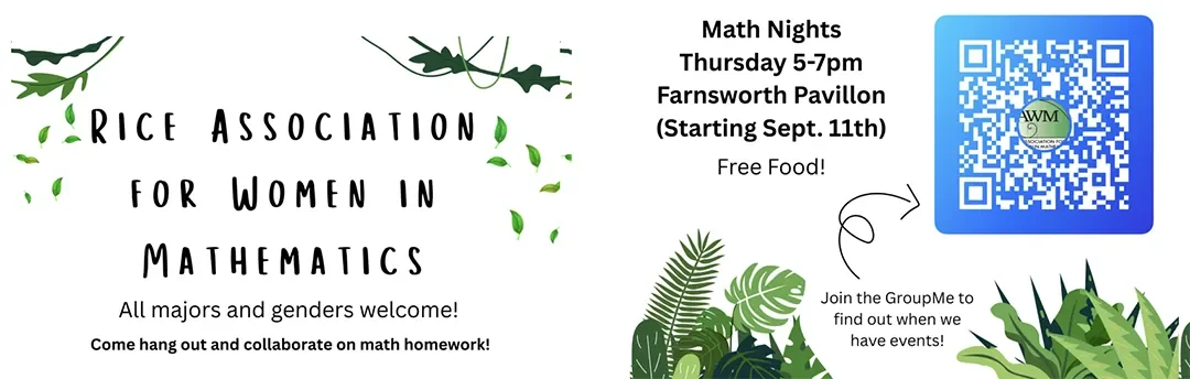 Rice AWM will be hosting Math Night every Tuesday from 7-9PM at Farnsworth Pavilion from September 3rd through December 3rd. Stop by to work on problem sets, get help with courses, or socialize over free food! Everyone is welcome to attend!